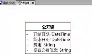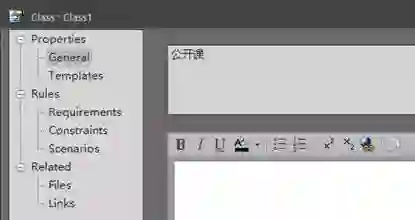 【步骤1】展开“分析”包下的“实体类”包,双击“实体类”类图。单击工具箱中的,单击类图空白处,在弹出属性框中的“General”页签的左上角栏(即类名称)输入“公开课”。