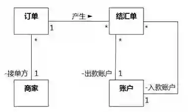 如果是给关联命名,最好给名称添加一个阅读方向,如图8-101所示,方向指示领域知识为“订单产生结汇单”。不过要注意,这个阅读方向只是为了方便理解领域知识,和关联的导航方向没有关系。有的建模工具不支持标注关联方向,可以通过统一偏向某一侧来表达阅读方向。