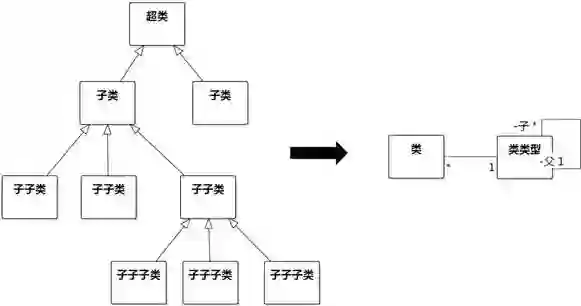自反关联对简化模型很有帮助。在许多分析模式和设计模式中,都可以看到自反关联。例如,当类结构中的泛化层次很深时,就可以通过把泛化结构转为更高级抽象的自反关联,如图8-111所示。