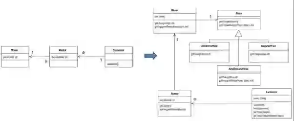 不过,如果具备一些领域建模知识,一眼就可以知道图8-9左侧类图犯了后文阐述的“照猫画虎”的错误,类图长得像用例图。系统的重要价值在于封装了Movie和Price之间的秘密。根本就不需要先走很多弯路再回正路。摸着石头过河是难免的,但应该在不得不摸的时候才摸,不应该假装看不见前人已修好的桥,无论大小事都主动追求摸着石头过河。