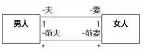 图8-108左侧是正确的。在任何时间拍摄快照,拍到的应该是一个男人最多和一个女人有夫妻关联。即使有其他女人,当时的夫妻关联应该已经断开了,如果要表达关联,只能叫“前妻”。如图8-109所示。在某个时间拍快照,是有可能拍到一个男人存在多个前妻的。