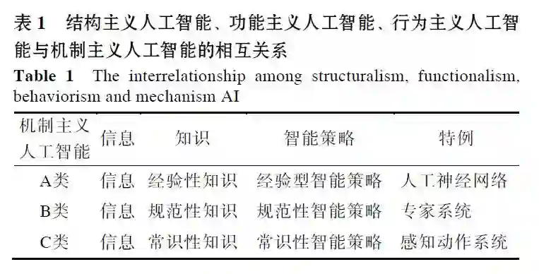 表 1 结构主义人工智能、功能主义人工智能、行为主义人工智能与机制主义人工智能的相互关系