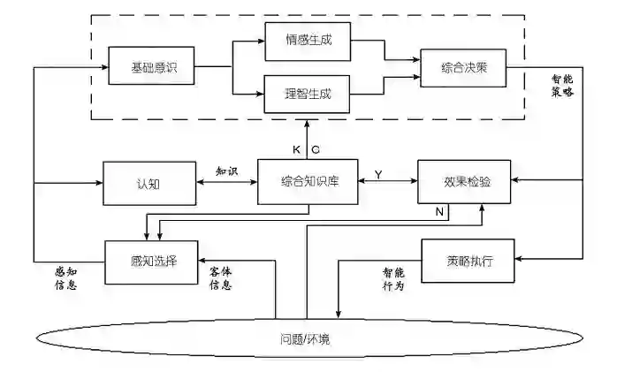 图2的模型看上去很复杂, 涉及到感知选择、认知、基础意识、情感、理智、综合决策和执行等复杂功能. 但是贯穿模型全局过程的功能主线却非常清晰, 这就是图中黑色楷体示出的“客体信息→感知信息→知识→智能策略→智能行为”转换, 或者也可以简记为“信息→知识→智能”转换. 这些转换过程构成了一切智能系统(人类智能系统和人工智能系统)智能生成的共性核心机制.