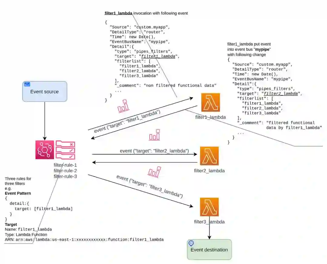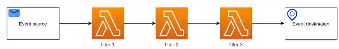 如上图所示,事件最初会到filter1_lambda中,因为客户端事件的detail.target属性与目标为 filter1_lambda 的filter-rule1事件模式相匹配。执行完成后,filter1_lambda 将事件的detail.target设置为下一个lambda,即filter2_lambda,并将修改后的事件发回给事件总线。由于 detail.target 的值是filter2_lambda,所以 filter-rule2就会被触发,如此反复。通过这个递归过程,所有的过滤器都会被执行。最后一个过滤器可以调用一些其他资源,而非调用next_filter() 工具层。