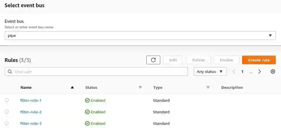 事件总线是 EventBridge 的关键组件之一。事件总线接收来自不同源的事件 / 消息,并将它们与一组定义的规则相匹配。EventBridge 有一个默认的事件总线,但用户也可以创建自己的事件总线。在这个 POC 中,我创建了一个名为“pipe”的事件总线。