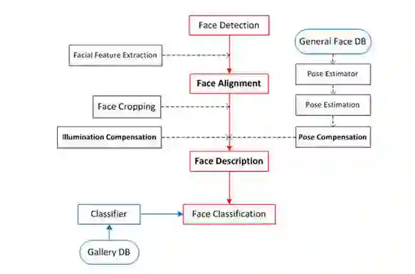 根据上面四个概念的介绍,我们可以了解到人脸识别主要包括三个大的、独立性强的模块: