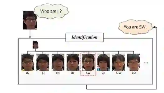 Face identification或Face recognition,人脸识别正如下图所示的,它要回答的是“我是谁?”,相比于人脸校验采用的pair matching,它在识别阶段更多的是采用分类的手段。它实际上是对进行了前面两步即人脸检测、人脸校正后做的图像(人脸)分类。