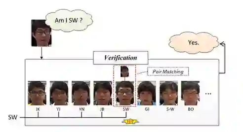 Face verification,人脸校验是基于pair matching的方式,所以它得到的答案是“是”或者“不是”。在具体操作的时候,给定一张测试图片,然后挨个进行pair matching,matching上了则说明测试图像与该张匹配上的人脸为同一个人的人脸。一般在小型办公室人脸刷脸打卡系统中采用的(应该)是这种方法,具体操作方法大致是这样一个流程:离线逐个录入员工的人脸照片(一个员工录入的人脸一般不止一张),员工在刷脸打卡的时候相机捕获到图像后,通过前面所讲的先进行人脸检测,然后进行人脸校正,再进行人脸校验,一旦match结果为“是”,说明该名刷脸的人员是属于本办公室的,人脸校验到这一步就完成了。在离线录入员工人脸的时候,我们可以将人脸与人名对应,这样一旦在人脸校验成功后,就可以知道这个人是谁了。上面所说的这样一种系统优点是开发费用低廉,适合小型办公场所,缺点是在捕获时不能有遮挡,而且还要求人脸姿态比较正(这种系统我们所有,不过没体验过)。下图给出了示意说明: