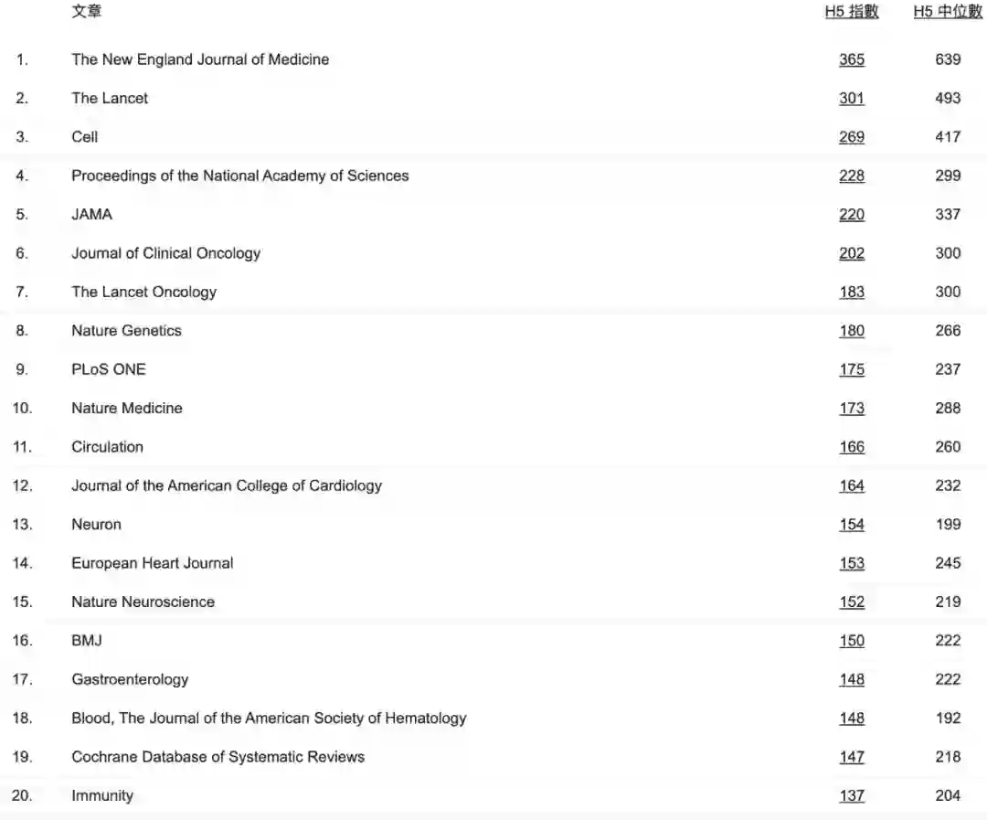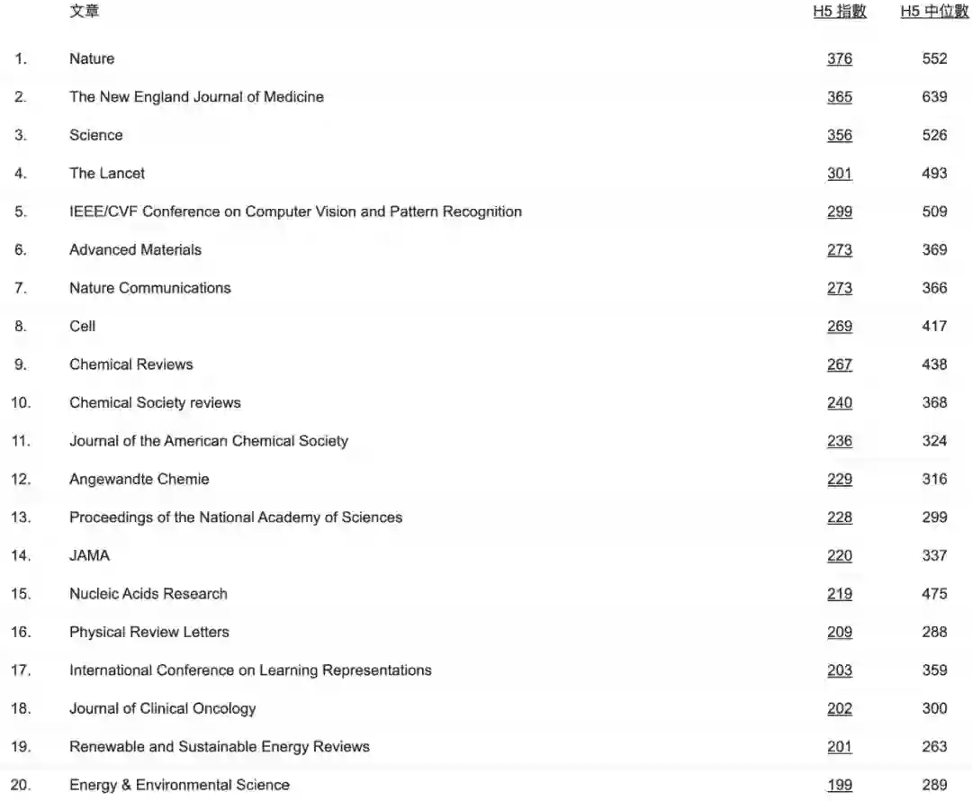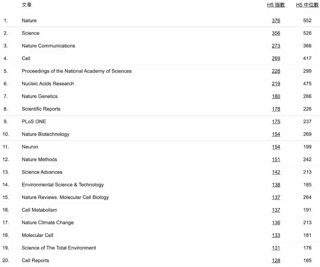 7月8日,谷歌发布了2020版的谷歌学术指标(Google Scholar Metrics,GSM),涵盖期刊为2015-2019 年间发表的所有文章。谷歌学术指标提供了一种简便的方法,让学者们可以快速评估学术出版物最近文章的影响力。 根据此次排名,Nature以376力压群雄,登顶排行榜。而被称为“神刊”(四大水刊)的PLOS One(IF=2.74)力压多个顶刊,进入医学及生命科学TOP10!超过Nature Med,排名第九。 h指数(h-index ) h指数(h-index )是一个混合量化指标,最初是由美国加利福尼亚大学圣地亚哥分校的物理学家乔治·赫希(Jorge Hirsch)在 2005 年的时候提出来的,其目的是量化科研人员作为独立个体的研究成果。Hirsch 的原始定义是,一名科学家的 h 指数是指其发表的N篇论文中有 h 篇每篇至少被引 h 次、而其余N-h篇论文每篇被引均小于或等于 h 次。Google 使用h5指数评价一个期刊的影响力,它表示的意思是 5 年内有 h 篇文章被引用超过 h 次。 谷歌h5指数的算法不同于影响因子,不光考虑期刊文章的篇均被引,是一个平衡发文量与被引次数的指标,其定义极具数学上的美感,具体可参见《扫盲一下谷歌H5指数》。