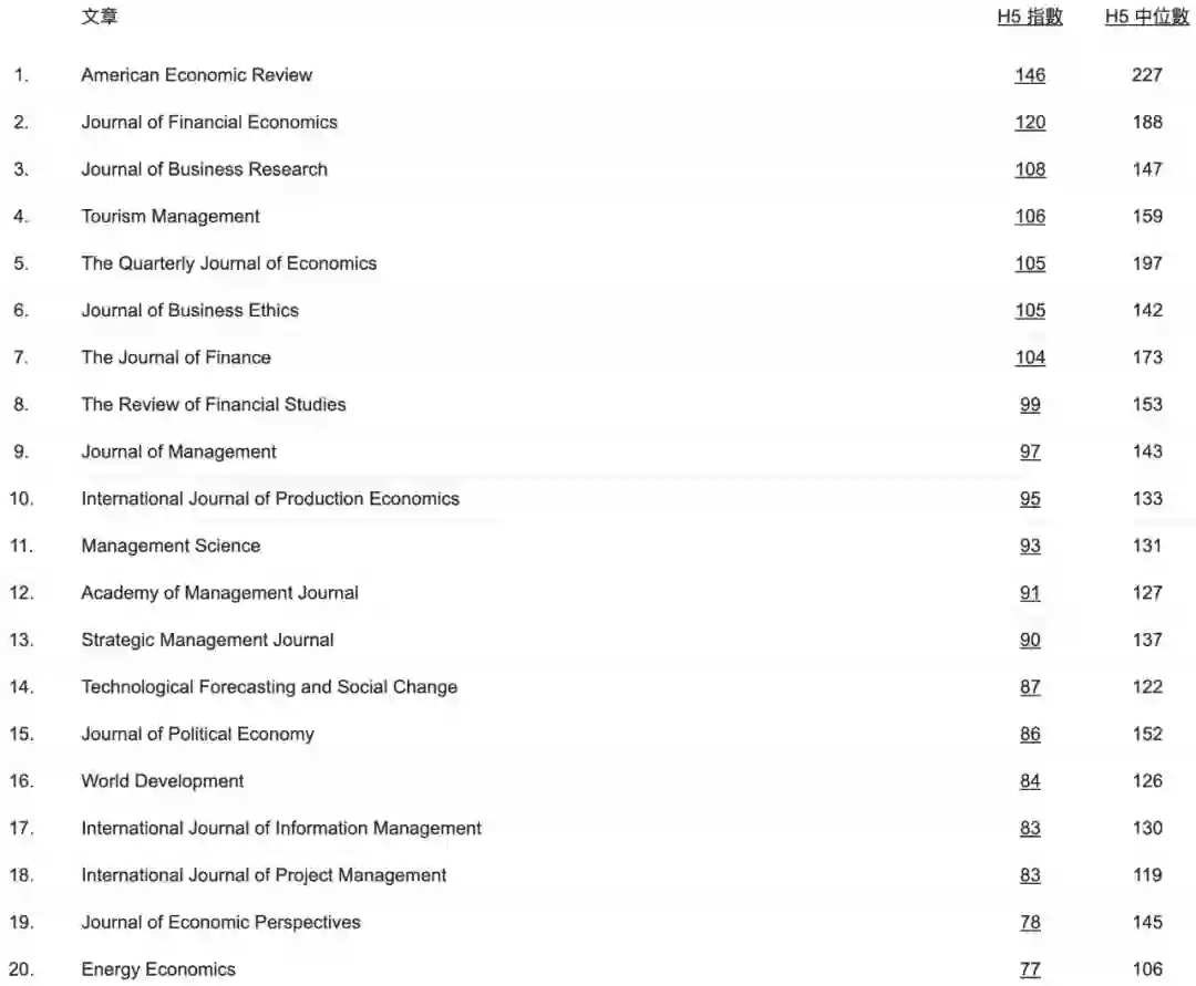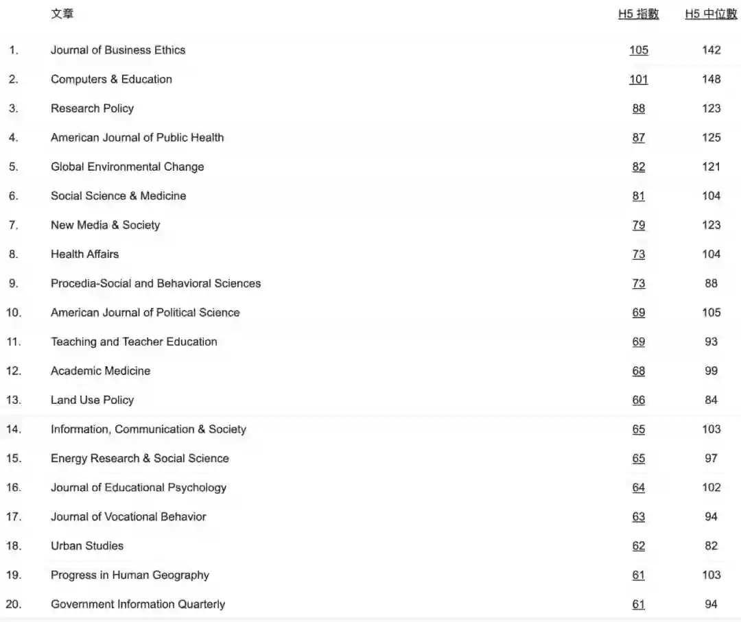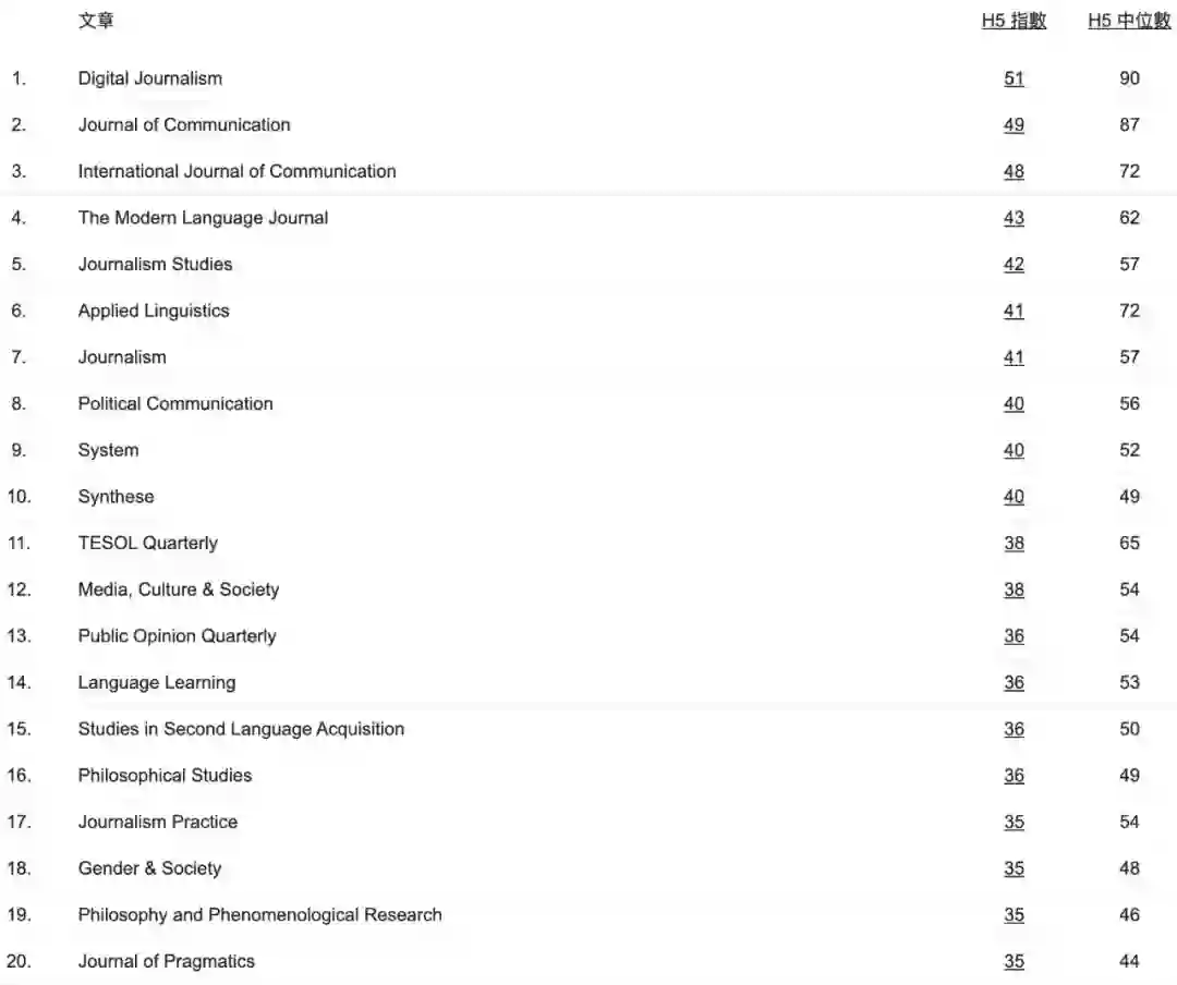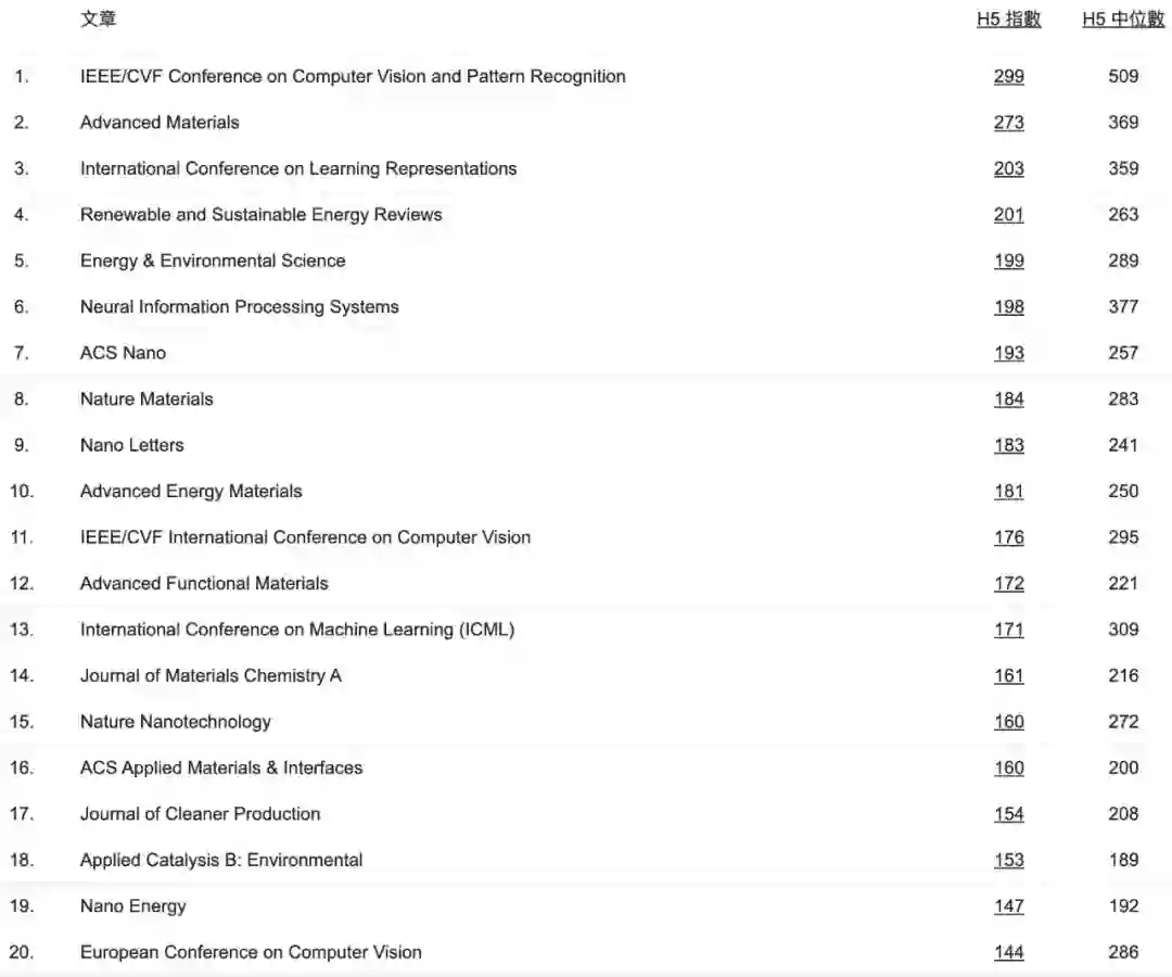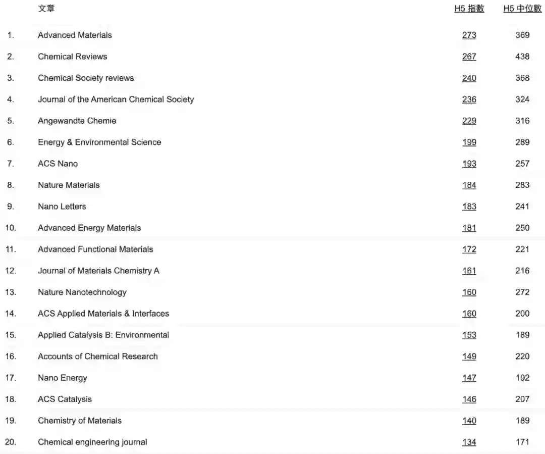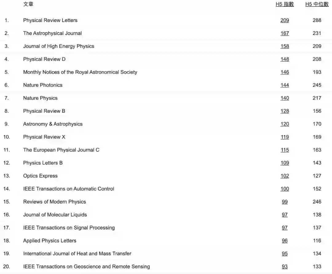 H5指数靠前的,基本上都是些发文量非常大的刊物,而影响因子最高的神刊 CA ,在H5指数排名中,前100名都没进去,究其原因还是:影响因子本质上是一个篇均引用次数,在总发文量不大的情况下,容易产生少量高引文章大幅拉高影响因子的情况。 而H5指数除了考虑每篇文章的引用次数外,还与期刊的总发表文章数量正相关,按其定义,在篇均引用次数差不多的情况下,某期刊发表的文章越多,其H5因子越容易上去,Nature、Science就是这种刊,用H5去衡量,简直就无敌了。 参考链接:https://scholar.google.com/citations?view_op=top_venues版权声明:本文来源科研大匠、察言观数,仅用于学术分享