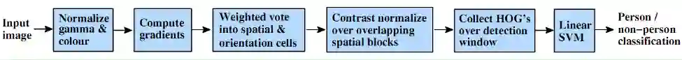 目前的行人检测基本上都是基于法国研究人员Dalal在2005的CVPR发表的HOG+SVM的行人检测算法(Histograms of Oriented Gradients for Human Detection, Navneet Dalel,Bill Triggs, CVPR2005)。HOG+SVM作为经典算法也集成到OpenCV里面去了,可以直接调用实现行人检测。