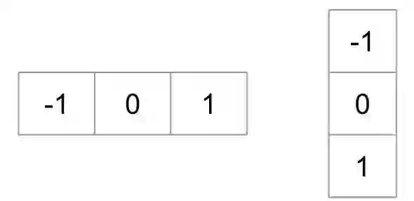 为了得到梯度直方图,那么首先需要计算图像水平方向和垂直方向梯度。可以通过使用以下内核过滤图像实现,分别用于计算水平梯度和垂直梯度。