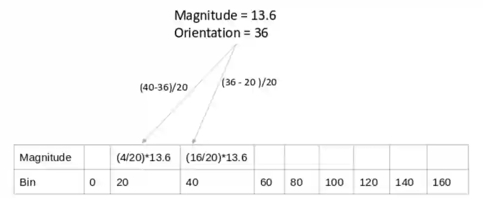 再比如:(如上图所示)某像素的梯度幅值为13.6,方向为36,36度两侧的角度bin分别为20度和40度,那么按一定加权比例分别在20度和40度对应的bin加上梯度值,加权公式为: