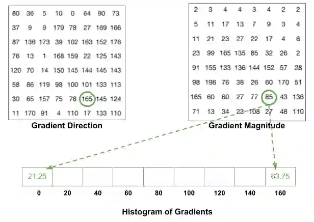 可以看到直方图中,0度和160附近有很大的权重,说明了大多数像素的梯度向上或者向下,也就是这个Cell是个横向边缘。