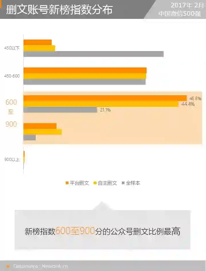 查看自主删文和平台删文的公众号新榜指数分布区间,将其与全样本的分布进行对比,发现无论是是自主删文还是平台删文,新榜指数位于600至900的公众号删文比例最高,这些公众号虽拥有一定的流量,但内容发布不及头部大号严谨,因此易被举报删文,同时为规避平台惩罚也愿意积极主动地删除不健康的内容以防封号造成流量的巨大损失。