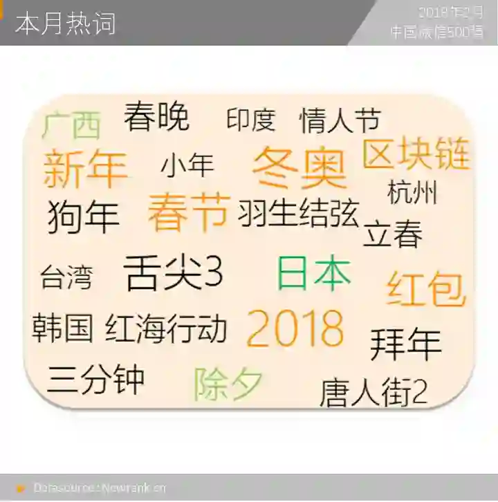 二月恰逢新春佳节,因此热词主题多数围绕春节展开,除此之外,近期最热互联网技术“区块链”、冬奥会及人气高涨的日本男子单人滑冠军羽生结弦均引起热议;陈可辛导演的催泪短片《三分钟》触动心弦,在春节前夕引爆网络;热映贺岁电影《红海行动》、《唐人街探案2》同样引起不少关注。