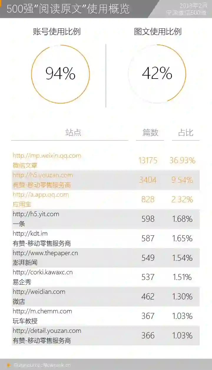 2月共有470个500强账号在35671篇内容中添加阅读原文链接,使用率达94%。 “一条”使用率较上月有所提升,达到1.7%,成为阅读原文第四大引流处,而引流至有赞和微店的数量略微减少。