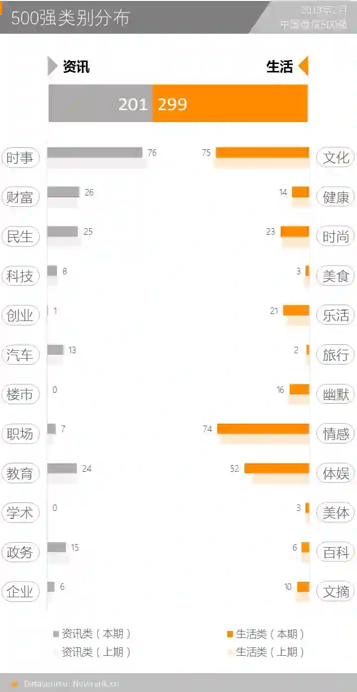 500强中所占席位最多的类别位次为:时事(76)、文化(75)、情感(74)、体娱(52)与财富(26)。五强类别占据500强席位的60.6%,虽然类别三强依旧为“时事”、“文化”、“情感”,但三强之间均只有一席差距,最大类别的竞争愈发白热化。