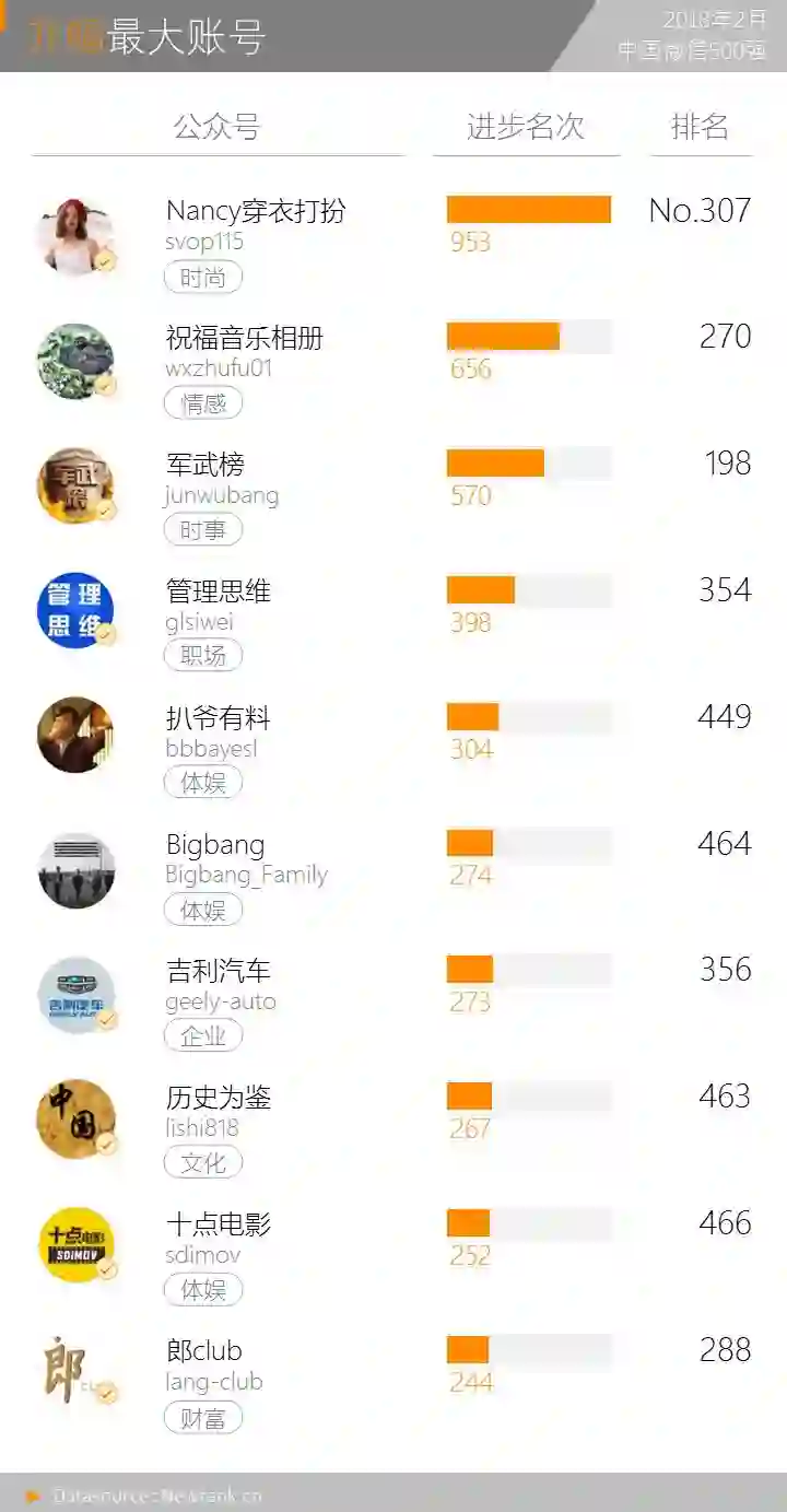 本月升幅榜中,首次进入500强的时尚类账号“Nancy穿衣打扮”独占鳌头,每天保持固定3条推文,平均阅读数环比增幅约100%,上升953名,收获升幅榜冠军;“祝福音乐相册”继去年11月之后再度跻身500强,以上升656名的表现位居升幅榜第二名;此外,“军武榜”、“扒爷有料”、“吉利汽车”、“历史为鉴”均为首次进入500强,“军武榜”势如破竹,升至第198位。