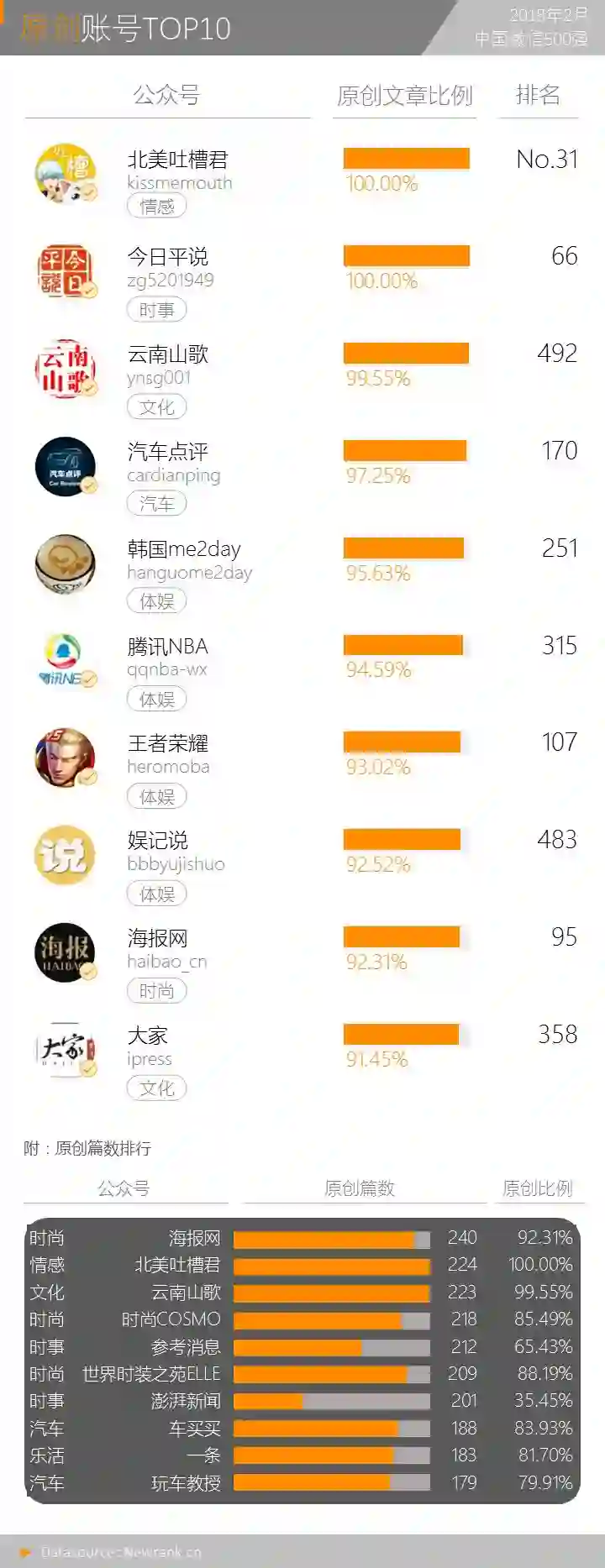 2月原创号各个发力,“北美吐槽君”、“今日平说”坚持百分百原创,携手夺冠;上月冠军“云南山歌”以99.6%的原创比例屈居第三;十强门槛91.5%,较上月提升近三个百分点。