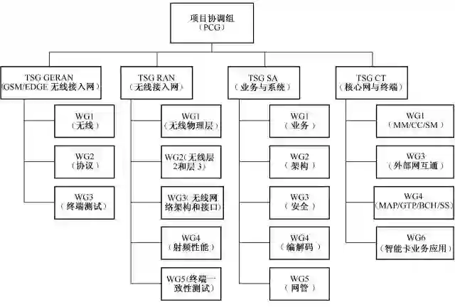PCG主要负责3GPP总的管理、时间计划、工作分配、事务协调等。TSG主要负责技术方面的工作。每一个TSG下面又分为多个工作组(WG,Work Group)。TSG可以根据工作需要,新建工作组。工作组就是真正负责干活的了,承担具体的任务。