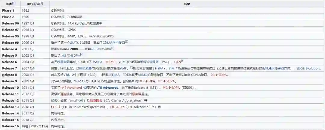 3GPP制定的标准规范以Release作为版本进行管理(大家通常听说的R99,R4,R5,这个R就是这里Release的R),平均一到两年就会完成一个版本的制定。从建立之初的R99,之后到R4,目前已经发展到R16。R16也就是5G标准的第二阶段。R15是5G标准的第一阶段,去年已经完成。