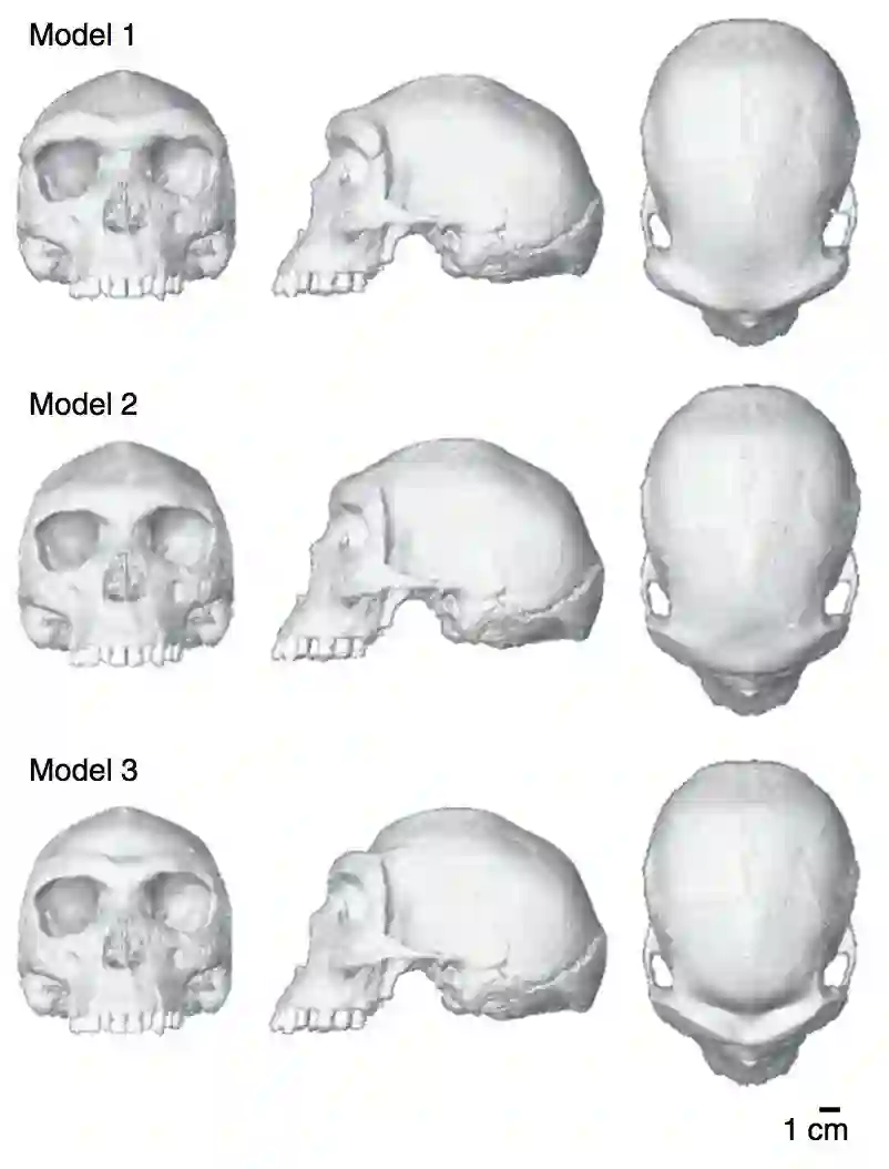 ○ 1.Kabwe 1的原始重建模型;2.削减过眉骨的 Kabwe 1的重建模型;3.削减了眉骨并加上了和眶后沟的Kabwe 1重建模型。| 图片来源:Ricardo Godinho et. al.