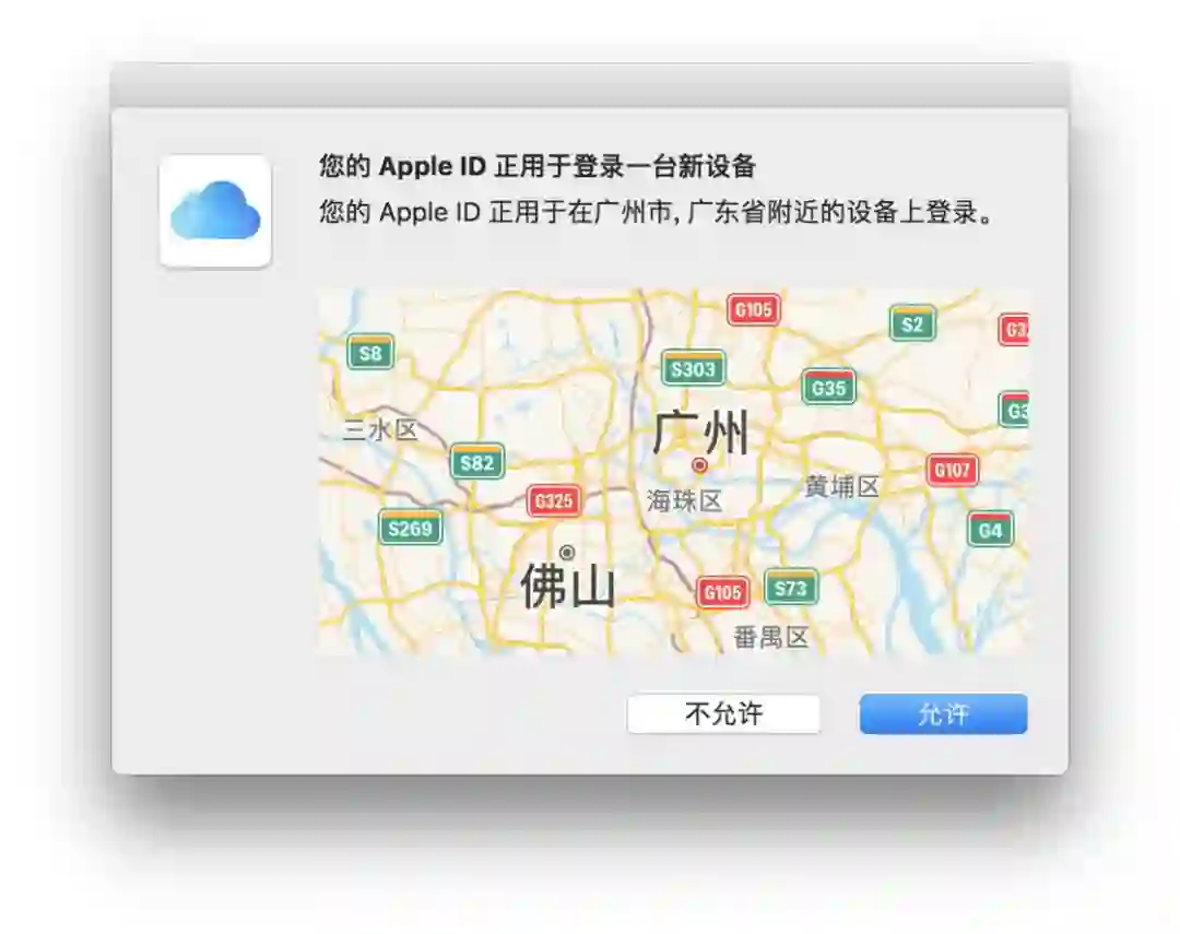 而苹果「双重认证」服务的性质则和「两步认证」类似,只不过它不是通过短信验证码的形式发送验证信息。当你在新的地点或设备上登录 Apple ID 时,苹果会直接在你的 iOS 设备或 Mac 上弹出弹出登录提醒,并生成一个 6 位数的验证码,只有输入正确的验证码才能继续进行操作。