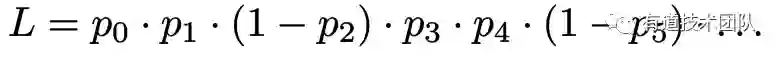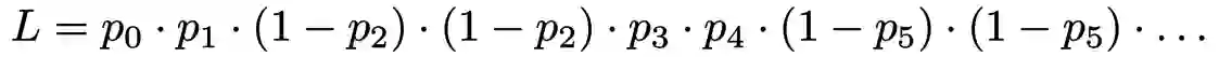 这个函数虽然看起来复杂,但如果对它取指数(L=exp(-l)),会发现这是全部样本均预测正确的概率。比如样本集的标签值分别为 (1, 1, 0, 1, 1, 0, ...),则: