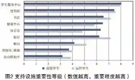 图2显示了支持设施的重要性等级。面授学生和远程学生都将学生服务中心(提供非餐饮零售服务,如文具、装订和复印服务)排在首要位置,紧随其后排在第二、三位是便利店和书店。然而,面授学生与远程学生中也存在差异,例如,面授学生认为健康中心和体育馆更重要,而远程学生则认为银行和邮局更重要。