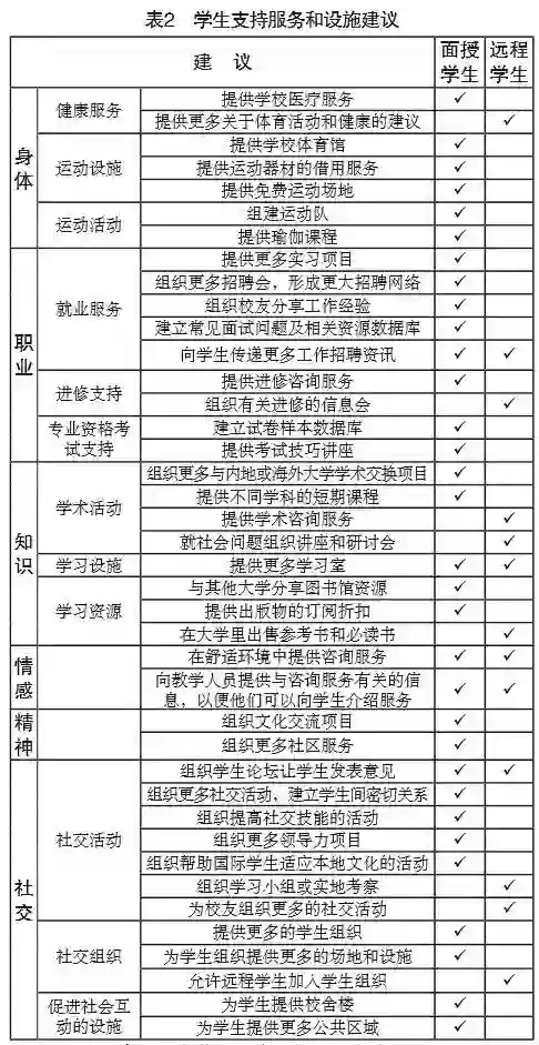 根据六个发展维度,表2列出了学生和工作人员对学生支持服务和设施的建议。