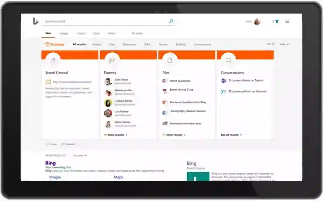 新搜索也将包含 Windows 搜索,并能在搜索结果中显示本地文件。使用Microsoft 365 的用户将体验到更大的价值。当用户注册使用 Office 365 账户时,搜索结果将包括 SharePoint 或 OneDrive 中的文档、Teams 或 Yammer 中的对话内容以及公司联系人,甚至在 Bing 搜索中也能实现这些功能。而且,微软也计划之后提供第三方数据源。