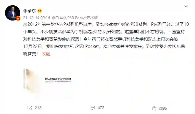 华为手机今日正式确认将于 12 月 23 日 15:30 举行华为冬季旗舰新品发布会,届时将推出华为新款折叠屏手机 P50 Pocket。随后,华为消费者业务 CEO 余承东、华为消费者业务手机产品线总裁何刚第一时间转发消息为新品站台预热。