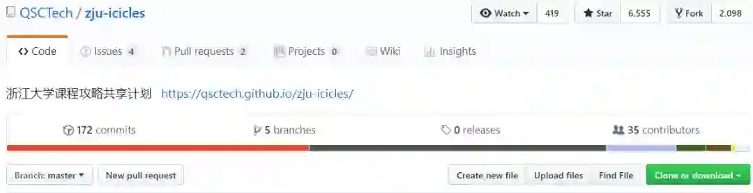 目前该项目已经获得6555 个Star,2098 个Fork,(GitHub地址:https://github.com/QSCTech/zju-icicles)