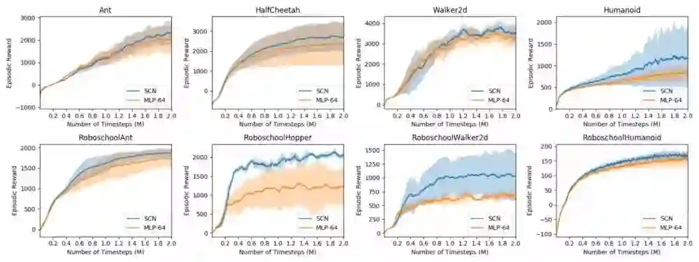 使用PPO作为训练算法,训练结构化控制网络(蓝色)与多层感知器(橙色),在2M时间步长time steps下的训练曲线。与现有的先进技术相比,我们在最终奖励和采样效率方面都显示出了显着的提高。