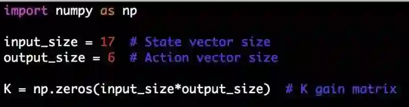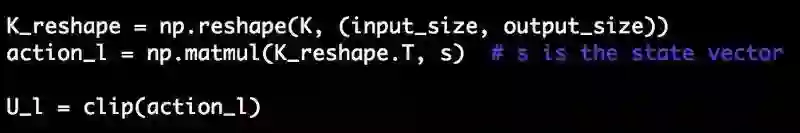 我将K增益矩阵向量调整为(input_size x output_size)大小的矩阵。 转置这个结果矩阵产生动作矩阵,大小为(output_size x input_size。)。这个动作矩阵乘以(input_size x 1)大小的状态向量后,可以得到一个(output_size x 1).大小的动作输出向量。