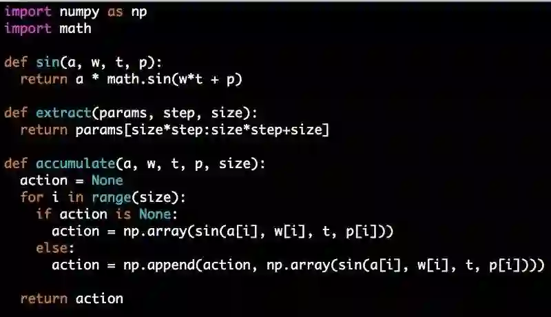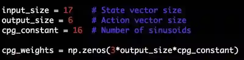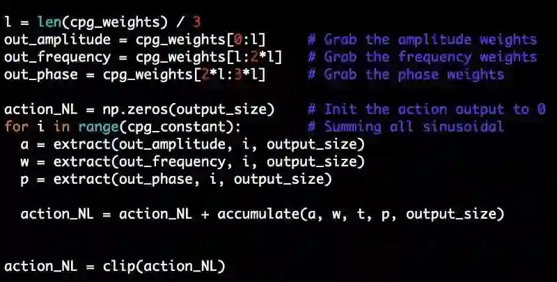 花一分钟来消化代码。本质上,这里所发生的是,对于output_size向量中的每个动作值,我们通过提取输入到正弦波中的振幅、频率和相位来产生正弦输出。我们对操作向量中的所有output_size项执行此操作,对于每个迭代,将所有cpg_constant迭代组合在一起(因此在我们的示例中,对每个操作项值将16个正弦输出相加)。最后,我们将输出向量与线性控制项相同地裁剪,然后根据SCN将这两项相加。
