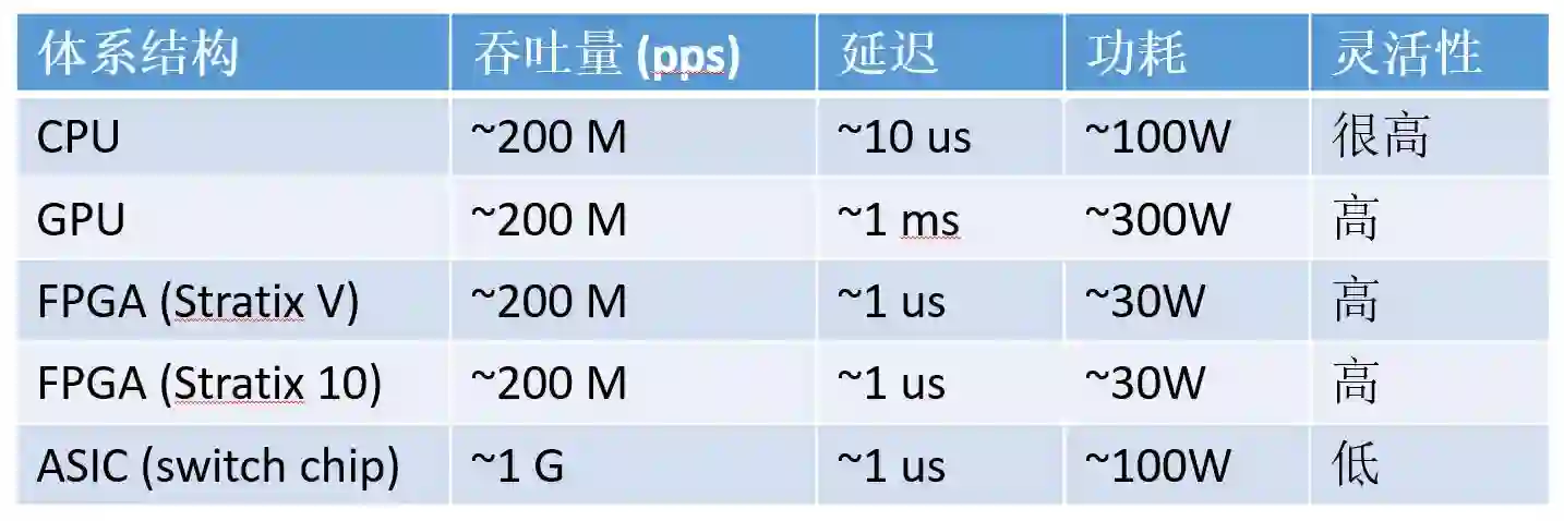 通信密集型任务,CPU、GPU、FPGA、ASIC 的数量级比较(以 64 字节网络数据包处理为例)