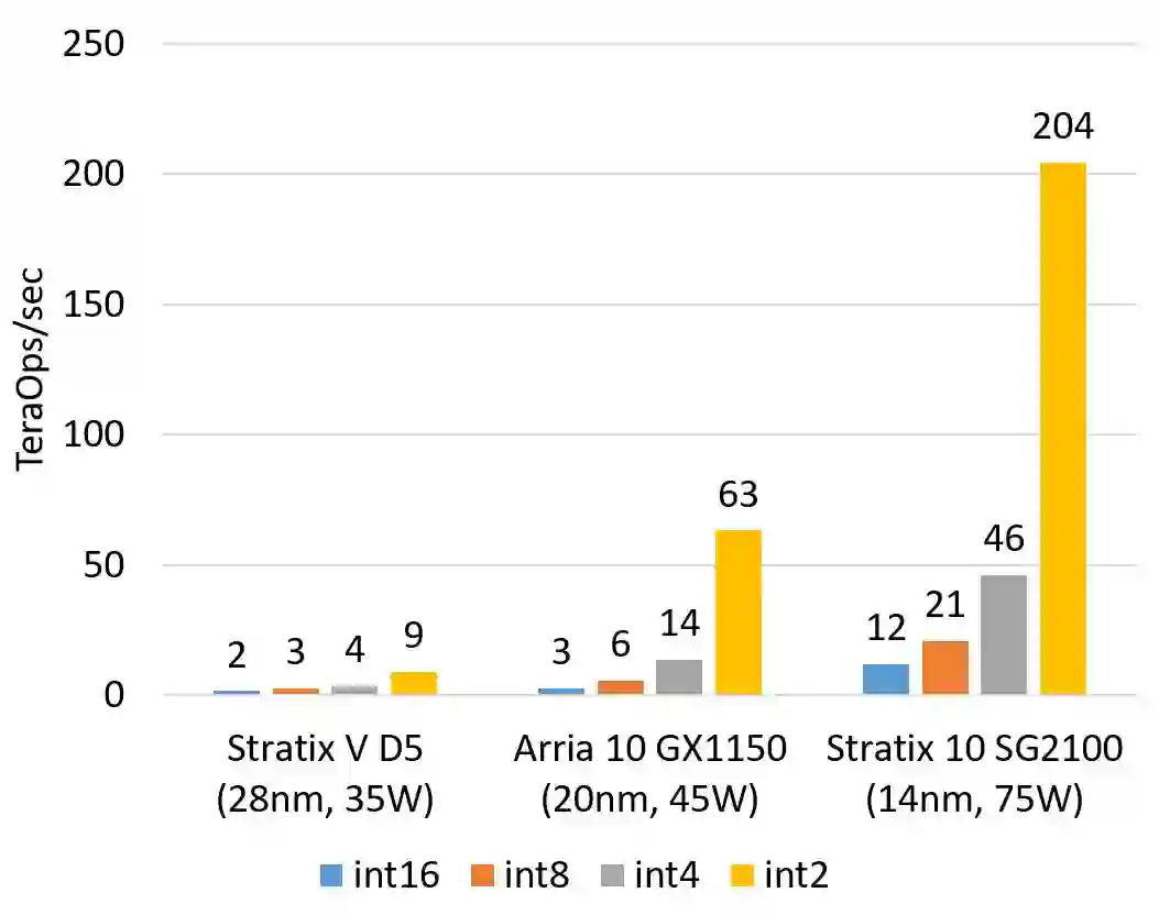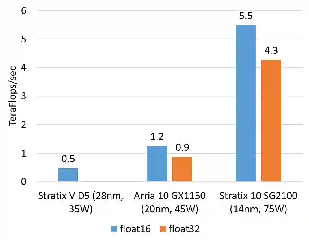 计算密集型任务的例子包括矩阵运算、图像处理、机器学习、压缩、非对称加密、必应搜索的排序等。这类任务一般是 CPU 把任务卸载(offload)给 FPGA 去执行。对这类任务,目前我们正在用的 Altera(似乎应该叫 Intel 了,我还是习惯叫 Altera……)Stratix V FPGA 的整数乘法运算性能与 20 核的 CPU 基本相当,浮点乘法运算性能与 8 核的 CPU 基本相当,而比 GPU 低一个数量级。我们即将用上的下一代 FPGA,Stratix 10,将配备更多的乘法器和硬件浮点运算部件,从而理论上可达到与现在的顶级 GPU 计算卡旗鼓相当的计算能力。