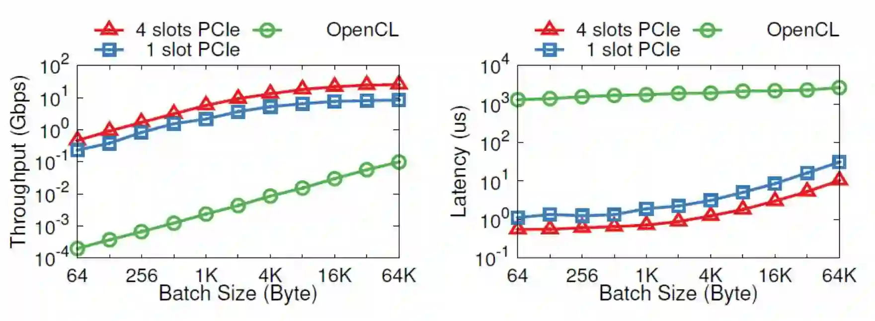 PCIe I/O channel 与 OpenCL 的性能比较。纵坐标为对数坐标。来源:[5]