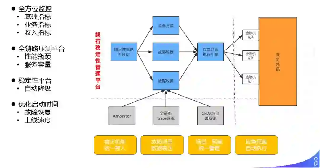③ 基础平台:CHAOS 服务治理平台,全链路 TRACE 平台,BTS 实验平台,模型工程平台,一键压测平台,磐石稳定性平台,特征调研平台。