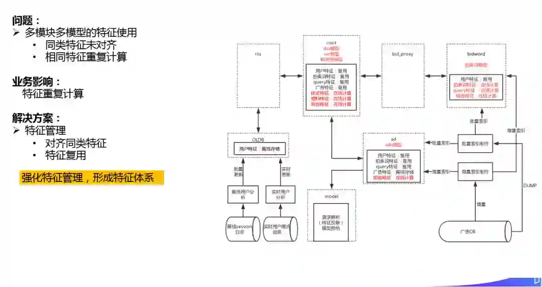 对于多模型的特征使用问题。以我们的卧龙系统为例,比如我们的 root 模块和 ad 模块,都使用到了广告特征,属于同类特征。但 root 的 dsa 模块中广告特征的抽取逻辑和 ad 模块中的抽取逻辑由于历史的原因可能不一致,这就是同类特征的未对齐问题。还有就是即使特征的抽取逻辑完全一致,但实际上也是重复抽取了两次,存在冗余的计算。