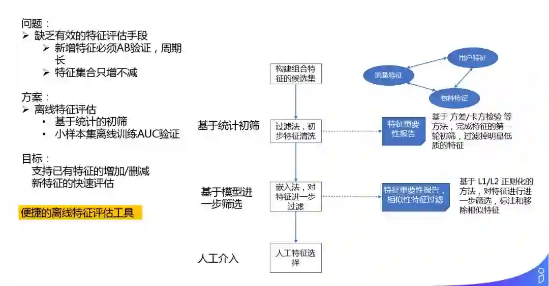 还有就是我们提供了一套简单的离线特征评估工具,可以基于小样本集评估特征的质量,避免把所有特征调研的验证工作都带到线上。