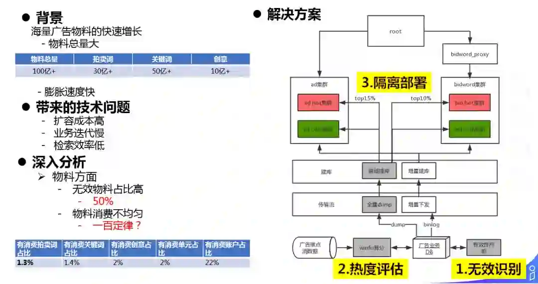 背景:冷热分库的背景就是在搜索广告系统中特有的海量广告物料的快速增长。搜索广告中物料主要来源于广告主的四层账户物料和拍卖词,物料的增加主要来自于广告主的买词和新增创意行为。可以想象,随着广告主规模的扩大,物料一定是海量,并且快速膨胀的。