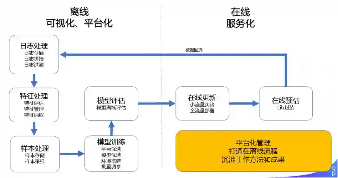 通过模型工程平台化的管理,在整个模型工程的离线处理从日志处理->特征处理->样本处理->模型训练->模型评估,做了集中化的管理和可视化的操作;其次,我们打通了在离线的流程,比如使用者在模型训练出来后,可以一键上线;最后,模型工程平台成为我们沉淀工作方法和成果的平台。