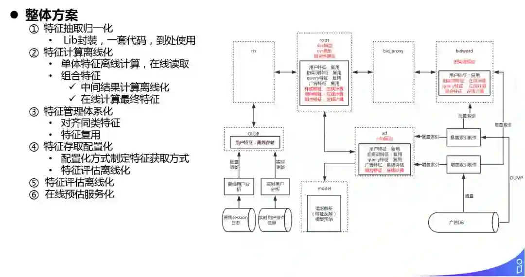对于这块的我们主要通过特征计算离线化的方式进行优化,大家可以看一下我们系统中用到的主要特征,例如用户特征,query 特征,拍卖词特征,ad... 这些特征都是单体特征,对于这类特征,我们通过离线计算,在线获取的方式进行了优化,对于组合特征,我们离线计算好中间结果,只对最后的 combine 环节做在线计算,最大优化性能。此外,我们还通过插件配置化的定义特征获取的方式,提升了这块的工作效率。