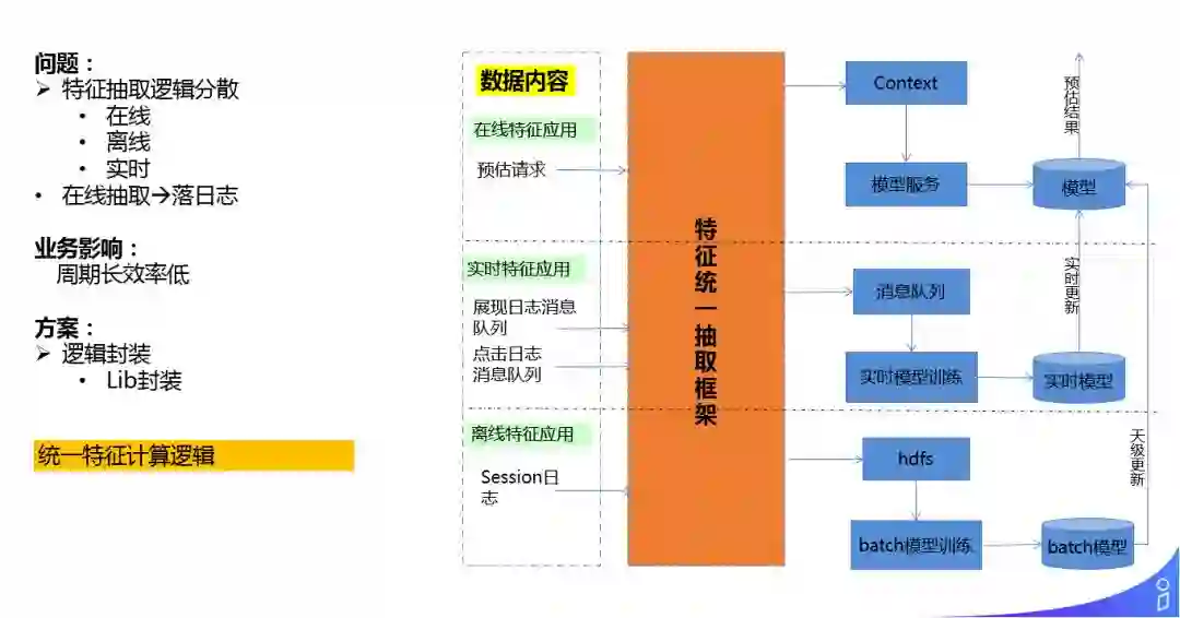 特征这块最主要的问题就是抽取逻辑分散:在线,离线,实时这三个场景下我们有三套不同的抽取逻辑,并且因为可维护性比较差,在离线抽取特征的结构存在着8%的 diff,这就导致后续几乎所有的特征调研都走的是在线抽取+落日志的这种抽取方式,对业务的影响就是特征调研需要攒数据,周期长并且效率低。
