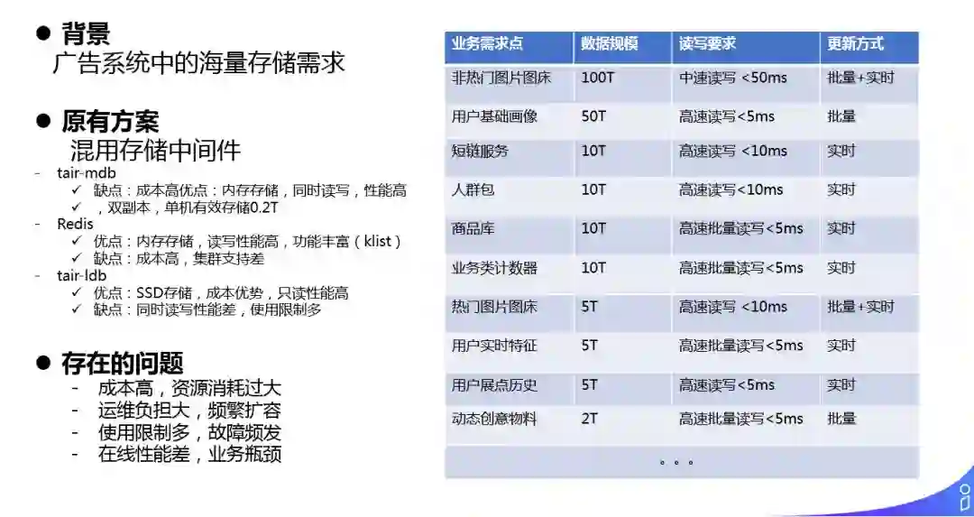 背景:这是我们广告系统中所面临的不同的存储需求,每种存储需求都有不一样的数据规模、读写要求和更新方式。