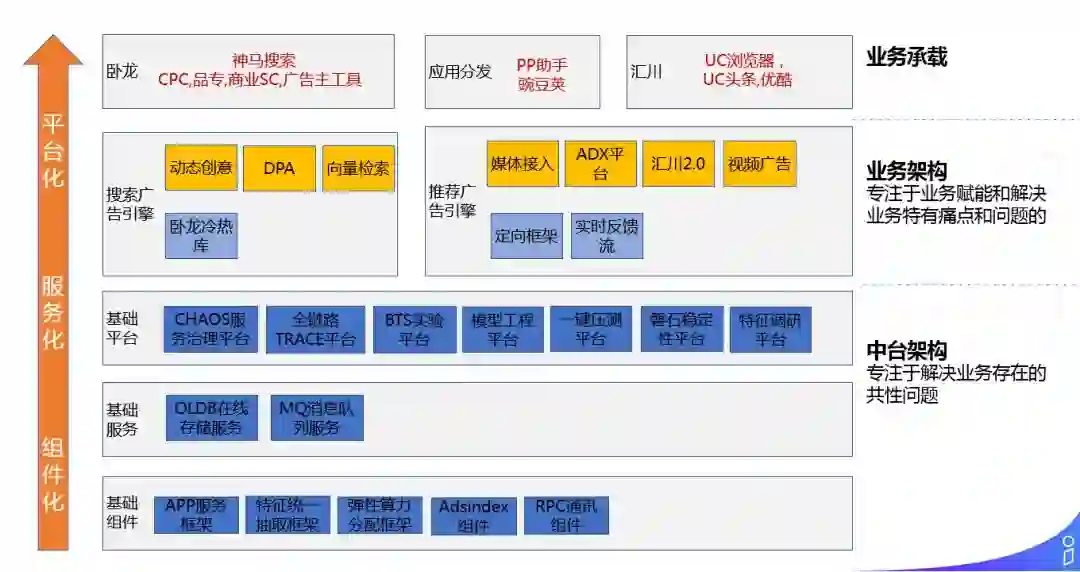 业务架构:专注于业务赋能和解决业务特有痛点和问题。比如在搜索广告中会做一些动态创意,商品检索库等事情。对于展示类广告,比如媒体接入平台以及广告交易平台 ADX 等,都是展示类广告所需要做的事情;另一方面通过针对性的架构优化解决业务的特有问题 ( 如冷热库,定向框架,实时反馈流等 ),综合来推动业务的发展。