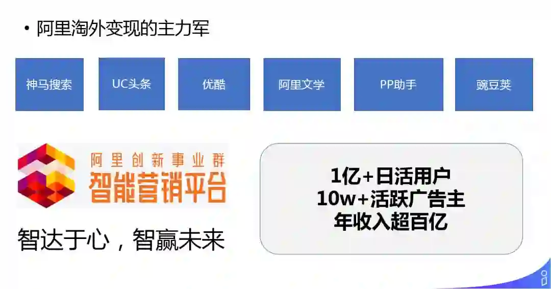 智能营销平台依托于阿里创新事业群和阿里大文娱的媒体矩阵 ( 包括神马搜索、UC 头条、优酷、阿里文学、PP 助手、豌豆荚等 ),可以覆盖1亿+的日活用户,在广告主侧,有 10W+ 的活跃广告主,年收入超过百亿,成为阿里淘外变现的主力军。